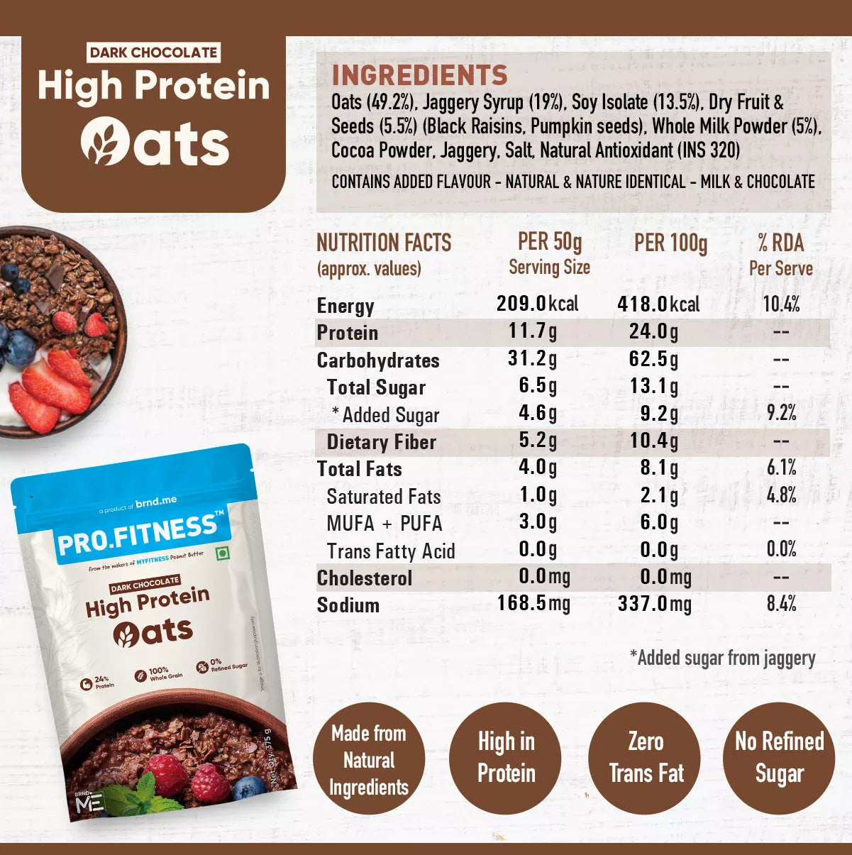 Packed with protein, fiber, and essential nutrients, Pro.Fitness Dark Chocolate Oats is a guilt-free indulgence for those who prioritize their health without compromising on taste. Enjoy this as a nutritious breakfast that boosts your well-being and supports your fitness goals.